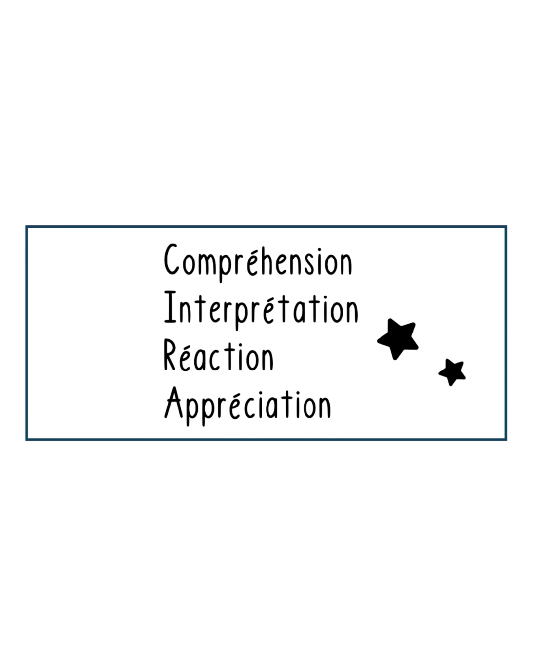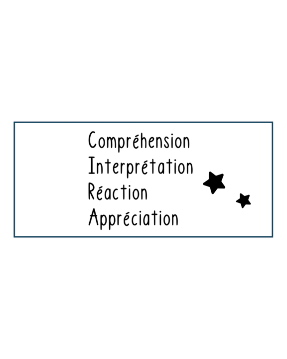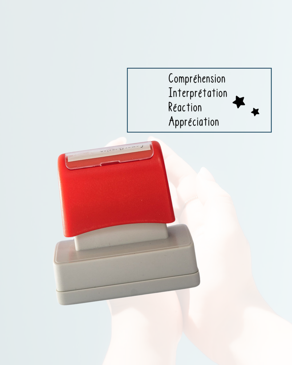 Vous aurez deviné que je cherche toujours à trouver une façon optimale et rapide à la correction. Ici, j'ai créé ce modèle pour s'agencer avec les autres étampes d'évaluations déjà disponibles. Vous pourrez utiliser cette étampe rectangle pour évaluer les différentes dimensions de la lecture. Devant chacune de celle-ci, vous pourrez utiliser le système qui vous plait : Système de couleurs (vert, jaune ou rouge), un système de lettres (A,B,C,D,E) ou un système de pointage.
