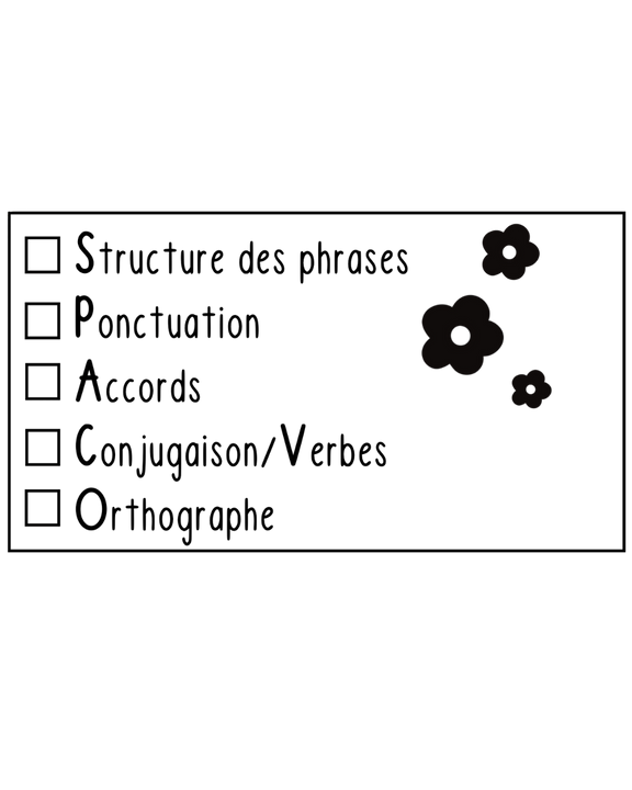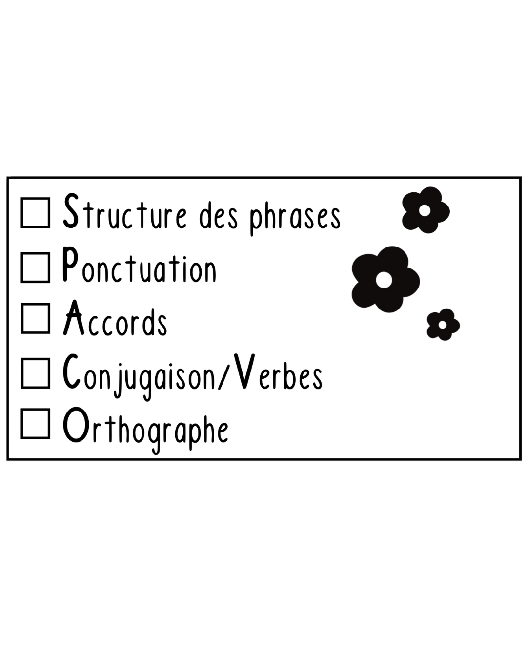 Pour vos élèves : Vous pourrez apposer l'étampe sur les textes ou productions écrites de vos élèves. Elle leur servira de repère pour ne rien oublier lors de la correction de leur texte. Il leur suffira de cocher chacune des étapes lorsqu'elles seront accomplies.