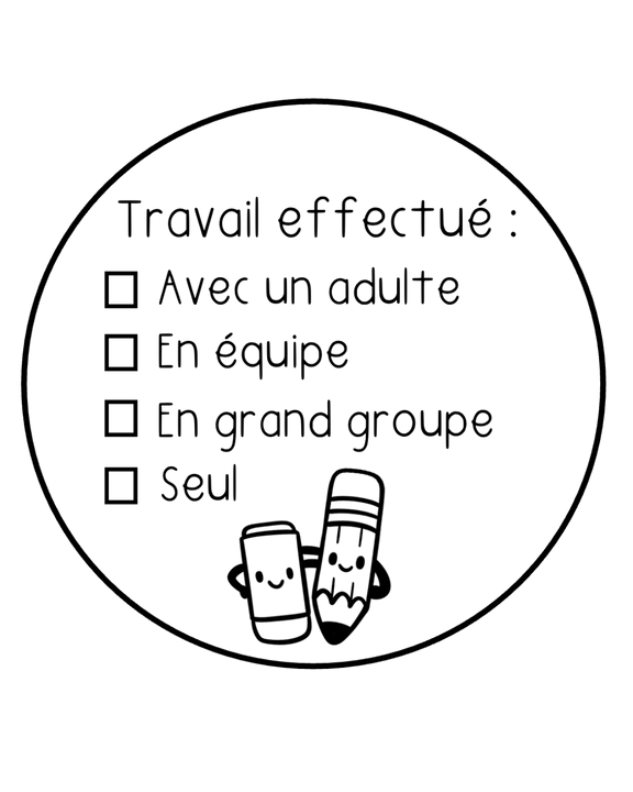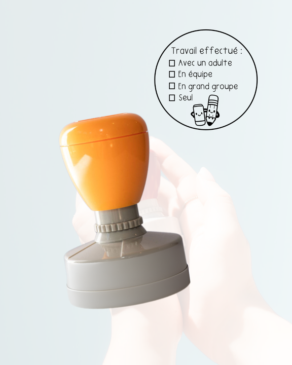 Ce modèle diffère de l'ancien. Vous remarquerez que j'ai modifié certains libelés et que j'ai ajouté Avec un adulte. Il s'agit d'une belle trace à laisser sur le travail de vos élèves pour ne pas oublier l'accompagnement offert ou simplement pour que les parents puissent en prendre connaissance. À noter que l'étampe est plus grande que les étampes régulières, alors chaque énoncé est très clair lorsqu'on appose l'étampe sur la feuille.