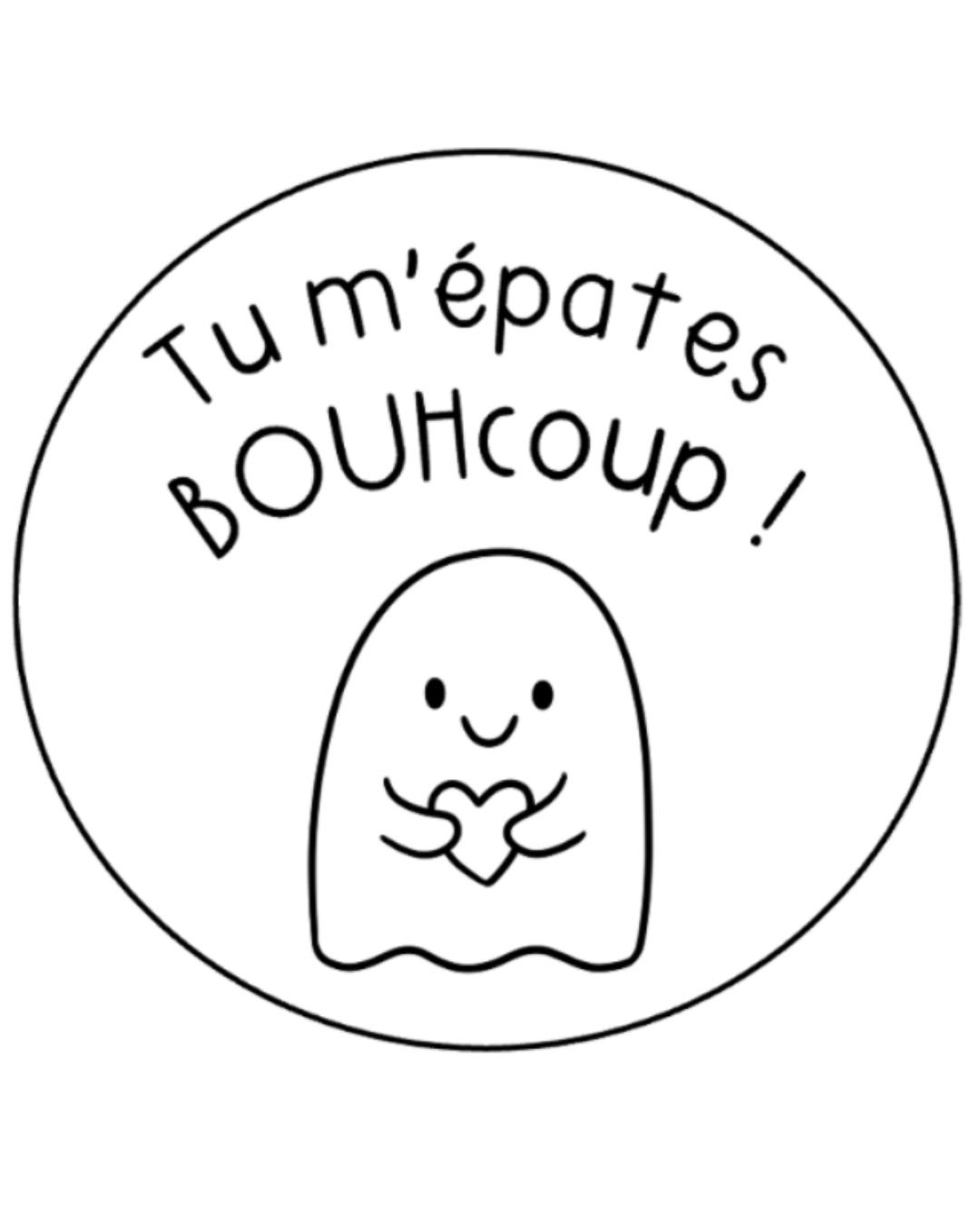 Vos élèves adoreront cette étampe. Le jeu de mots fait bien rire mes élèves. En plus, l'encre est noire, ce qui nous rappelle le duo de couleurs de l'Halloween. Et que dire du fantôme qui tient un petit coeur (je fonds hihi). Parfaite à utiliser pendant le mois de septembre, d'octobre ou tous autres mois finalement.
